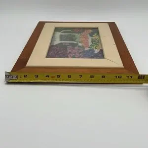 Beautiful framed crewel needlepoint depicting a vibrant garden scene. Features rich colors and intricate details in a rustic frame. Signed work dated 2001. Small pieces of fuzz(?) under glass (as photographed)