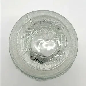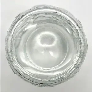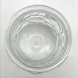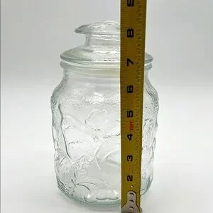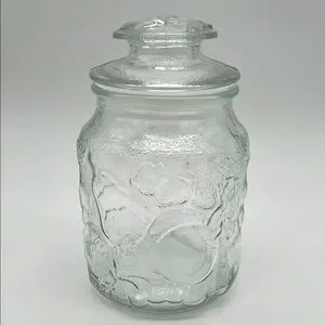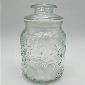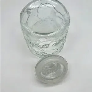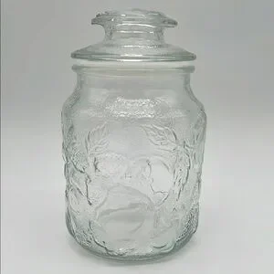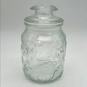 Elegant clear glass jar with a lid. Features embossed leaf and fruit design on both jar and lid. Perfect for storage or decoration. Like New Pre-Owned Condition. Lid has plastic gasket that makes lid fit snuggly. No chips or cracks.