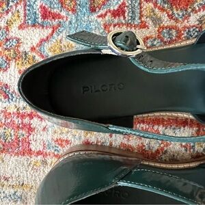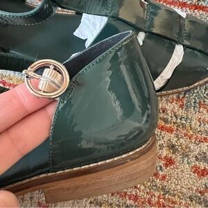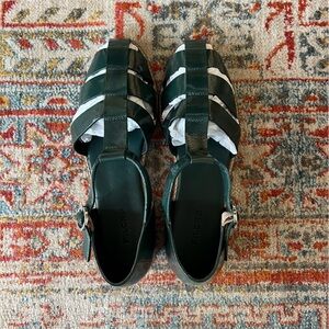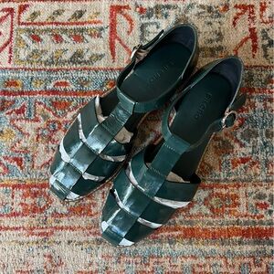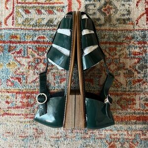 Beautiful "The Maris Fisherman" sandals in a dark green color in patent leather ("Green"). Pilcro @ Anthropologie.