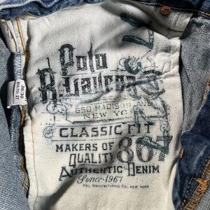 Relaxed fit jeans by Polo Ralph Lauren. Classic blue denim. Ideal for everyday wear. Has flaws on leg shown in photos.