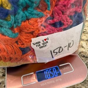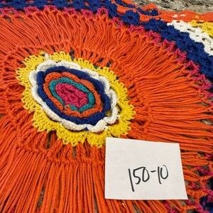 Crochet boho crop sleeve semi sheer sweater. Features a retro 70s style crochet sweater in vibrant royal blue, orange, teal, yellow, white and red, striped pattern with a large circular torso design, scoop neckline and a soft crocheted fabric. Appears to be handmade. No tags are present. In excellent condition. For reference the mannequin is a size 6. Please see photo measurements. Listed as SZ S/M.