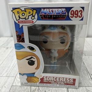 Funko Pop Sorceress from Masters of the Universe. Vibrant blue and orange design. Ideal for collectors.