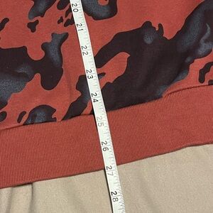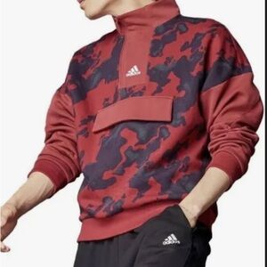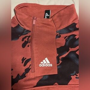 Adidas Men’s Large 1/4 zip sweatshirt. Red camo with velvet trim on sleeves. Anorak style snap pocket in front. Gently used.