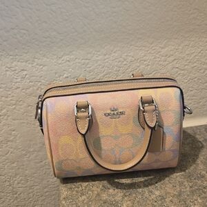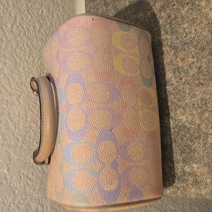 Coach satchel in soft pastel hues. Features tan leather accents. Ideal for everyday elegance.