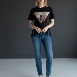 Elevate your casual look with this stylish black fringe graphic tee. Perfect for any laid-back occasion.