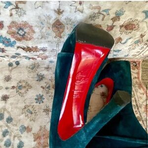 Chic teal platform peep-toe heels by Christian Louboutin. These stunning blue heels by Christian Louboutin feature a refined suede finish and a chic ruched detail at the front, making them ideal for formal occasions. The elegant design and eye-catching color ensure they stand out, while offering both style and comfort. These are a size 38.5 however this brand runs very small, and they would only fit a size closer to 7 . Please know your size in the brand before purchase ! No box or dustbag. Bottom has been resoled.