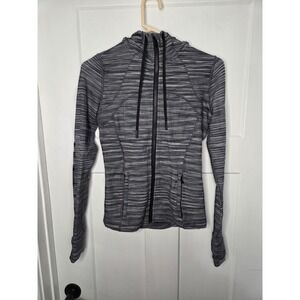 Elevate your active lifestyle with this Lululemon Athletica full-zip hoodie, a versatile layer designed for performance and comfort. Its dynamic striped pattern in shades of gray and white offers a modern aesthetic, while strategically placed seams contour to your shape for a flattering fit. The attached hood provides extra coverage, and integrated thumbholes keep sleeves securely in place during your most intense workouts. This piece seamlessly transitions from your morning run to a casual coffee run.