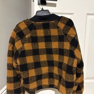 Stylish black and brown checkered jacket with quilted lining. Features a button-up front and zippered pocket.