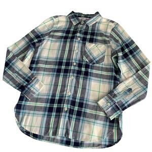 Features: Via Penny Lane Reworked Apparel | Sublime Custom Button Down Flannel; One of a kind nostalgic pieces with a modern twist. Old Navy blue/white/green plaid button up flannel shirt, Sublime graphic sewn onto the back.