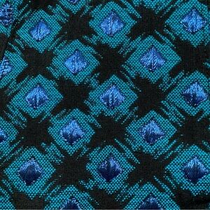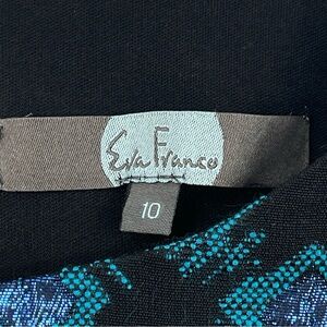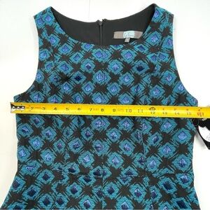 The NWT Eva Franco Sleeveless A-Line Dress in Black, Blue Metallic Shimmer is a stylish and elegant choice for weddings, parties, or cocktails. This knee-length dress features a round neckline, a zip closure, and is made of 100% polyester with a jacquard fabric type. The small square pattern and metallic blue accents give it a unique and eye-catching look.