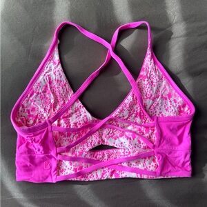 Stylish sports bra with vibrant pink pattern. Features a comfortable fit and supportive design. It’s reversible.
