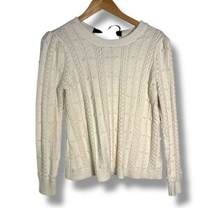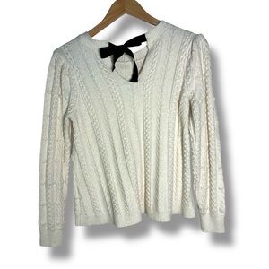 Cream colored cable knit crewneck sweater with tie back has a very delicate floral like pattern to the front and back as well as sleeves has a black tie back to the neck line, adding for an extra touch of elegance. In great condition size small