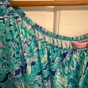 Vibrant jumpsuit with tropical print. Features shades of blue and green. Boat neck with elastic can expand to skim shoulders. Excellent condition.