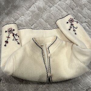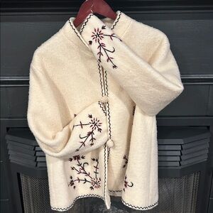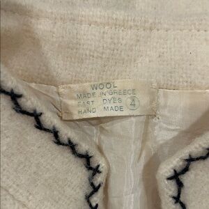 Fits like a Medium/large jacket. Stylish cream jacket featuring intricate floral embroidery in the front and on sleeves. Hand Made in Greece. Wool fully satin lined. Gorgeous one of a kind piece. No pockets.