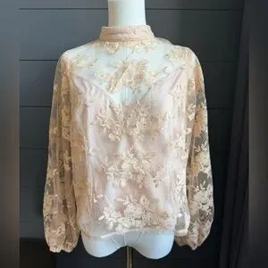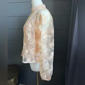 This elegant lace women top features a delicate floral design in a soft peach color. Perfect for adding a touch of sophistication to any outfit.