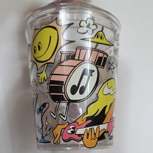 Vibrant plastic cocktail shaker with fun cartoon designs. Perfect for mixing drinks in style.