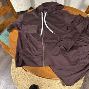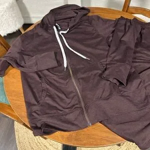 Kirkland maroon hoodie and matching pants. Comfortable and stylish lightweight buttery soft material. Too large for me and I missed the return window and forgot it was in the back of my car.
