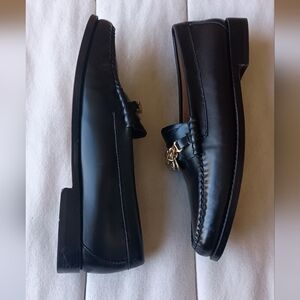 Step out in style with black loafers. Featuring elegant gold accents, these shoes offer a perfect blend of sophistication and comfort. Ideal for any occasion.