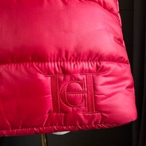 Carolina Herrera Stylish red puffer tote with signature logo.