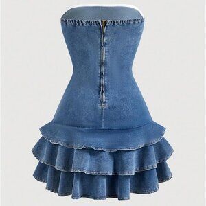Women's Strapless Denim Mini Dress Ruffle Layered A Line Bow Zipper