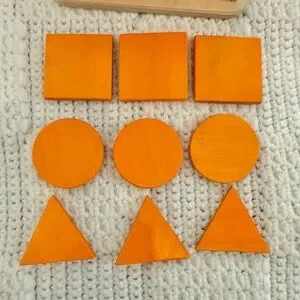Design: It is typically made from durable, non-toxic wood with smooth edges for safety. The set includes a wooden box with a slot on top and several shapes (circles, squares, and triangles) that fit through the slot.