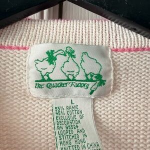 Quacker Factory pink and white cardigan with floral and hat designs. Size L There are two stain spots on the sleeve. See photo please.