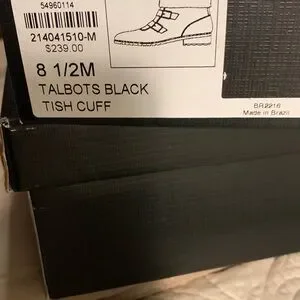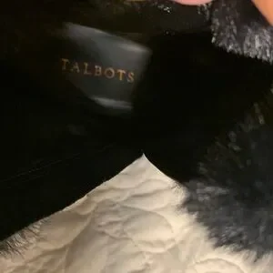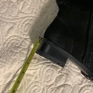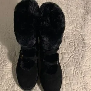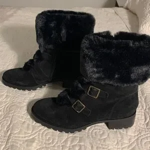 ‘Tish’ black suede lug sole boots have silky faux fur cuff and buckle detail. Side zip. Genuine leather. Perfect condition. Never worn. Size 8.5.