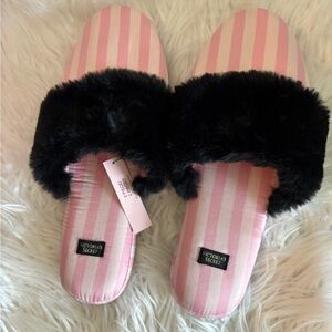 Victoria's Secret Signature Satin Slipper Pink Stripe Black Fur Trim NWT size M
