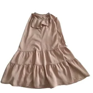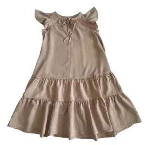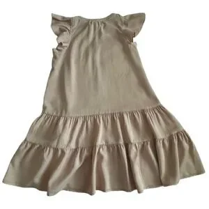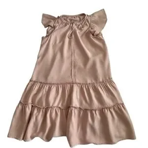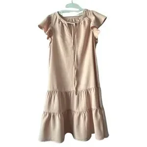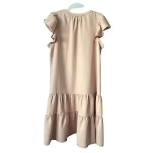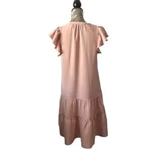 Other details: pullover dress, short ruffled sleeves, round neck goes into light V-shape/key hole style with strings closure. Two layer ruffled button. Loose relaxed fit. elegant and stylish. great for summer or hot weather.
