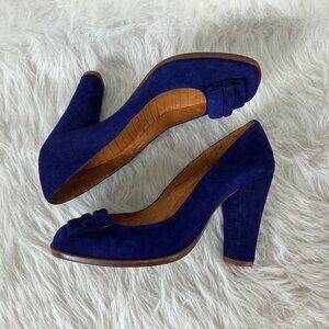 This is a pair of purple blue indigo suede leather, high heel, pleat square toe pumps from Chie Mihara. Very light wear on foot beds and soles.