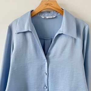 Soft satin-finish cropped blouse from ZARA in a light blue shade.