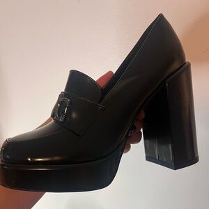 Platform loafers with a chunky block heel, crescent moon hardware details.