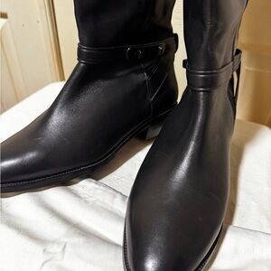 Chic black leather footwear by Coach. Glossy finish with a modern touch. My husband bought the wrong size from the Coach store 45 miles away. I thought I could make them work, so I don’t have the original box. I do have a dust bag, though.
