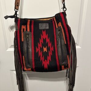 Southwest-inspired crossbody with bold pattern. Features fringe detail. Perfect for a stylish look.