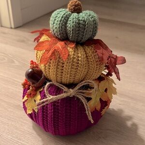 Add a touch of autumn charm to your home with this handcrafted knit pumpkin decor. Featuring vibrant shades of green, mustard yellow, and purple, this piece is perfect for enhancing your seasonal display. Features a twine bow and leaf/acorn accents