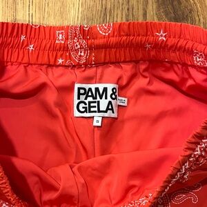 Striking vibrant res bandana print with windbreaker nylon fabric. Elastic waistband for everyday utility. Flattering dolphin cut. Pre used in great condition!