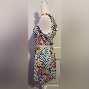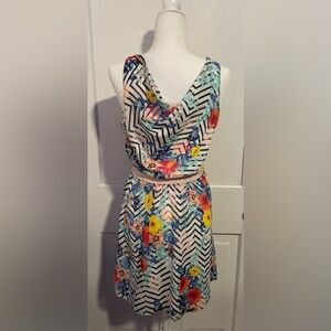 Vintage Candies midi dress with floral and chevron design. Sleeveless with cowl neck back and tie belt.