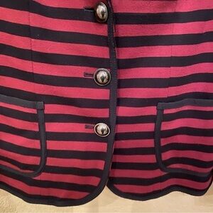 Pre-owned in great condition with no rips or stains. Women’s burgundy and black striped buttoned blazer jacket. Great for work or everyday wear. Dry clean only. Comes from smoke and pet free home.