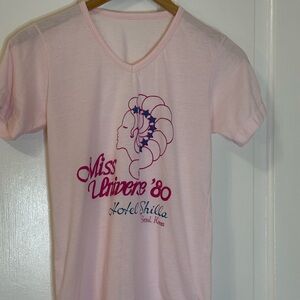 Pink Miss Universe Seoul, Korea 1980 graphic tee. Small spot on right side. I tagged, fits xs to small. Measured 12inch across chest. #MissUniverse