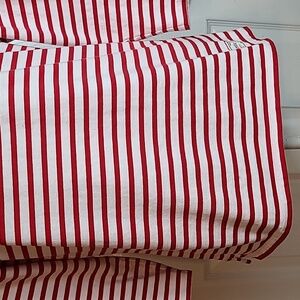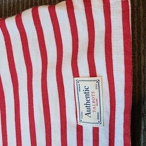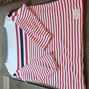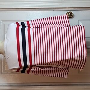 3/4 Length Sleeves, Boat Neckline, Loose Fit Body, White With Red and Blue Stripes, Signature Patch on Hemline, Size Medium.