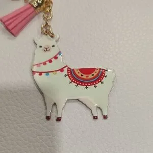 Charming llama keychain by Crystal Avenue. Features a pink tassel and colorful design.