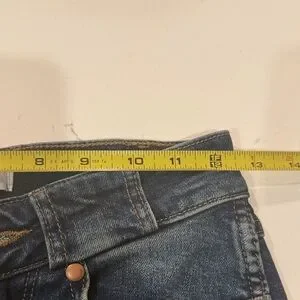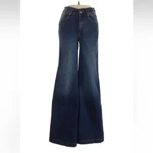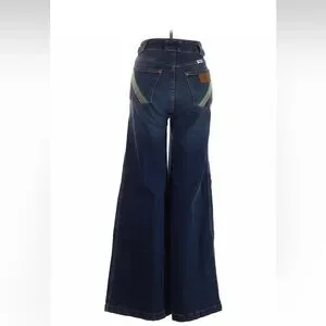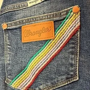 Chic dark blue flare jeans by Wrangler. Rainbow appliqué on back pockets.