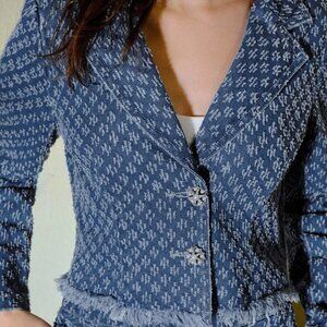 Blue Elegant Womens Denim Jacquard Lapel Collar Raw Edge Jacket & Maxi Skirt Set