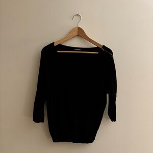 Chic black top by Express. Features a stylish side zipper. Ideal for a modern look. Flattering. Great with a pair of black jeans or dressy track pants. Can be worn as a scoop neck but is super flattering off shoulder