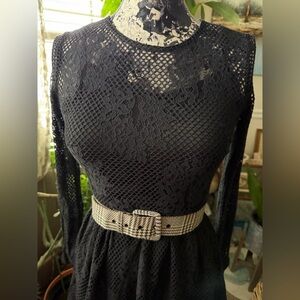 Elegant black lace dress perfect for dinner with your love or happy hour with the crew. This dress opens by zipper at the back with a beaded close near the nape of the neck. Measures 13 inches shoulder to shoulder, 15 inches pit to pit, and 18 inches waist to hem.