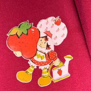Stylish red long sleeve tee by strawberry shortcake Features a cute strawberry design. Perfect for casual wear. There are four strawberries on one sleeve, and then there is a strawberry design on the chest. This has been worn