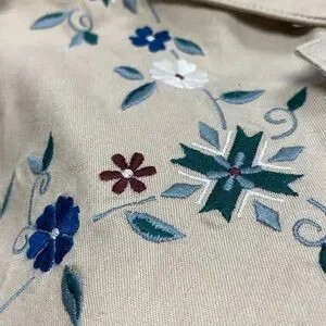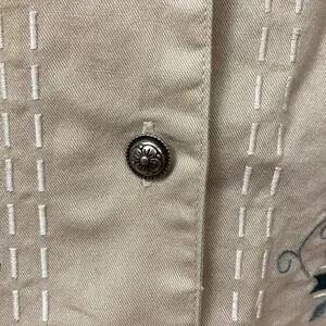 Beautiful embroidery on the chest. Silver tone floral buttons.