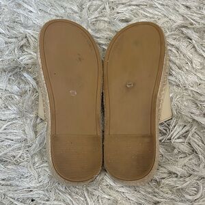 Tory Burch Two-Band Leather Espadrille Slides in Oat Milk. Size 9, in great pre-owned condition with some minor wear on the outsoles and there’s some small marks on the leather logo patch on insoles. Sold out style.