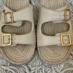 Tory Burch Two-Band Leather Espadrille Slides in Oat Milk Sz 9