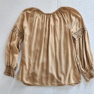 Solitaire tan women's top featuring intricate embroidery. Perfect for a stylish and comfortable look.